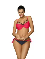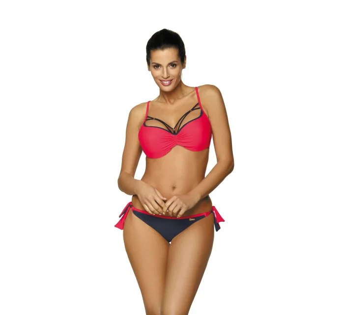 Biustonosz o usztywnianych miseczkach, z fiszbinami i wypełnieniem push up, wbudowanym na stałe do modelu. Świetnie unosi piersi, modeluje je i kusząco powiększa, co zresztą widać na zdjęciu. Strapsy (paski-gumki) są elastyczne, z biżuterią w złotym kolorze i mega modne. Dodają prawdziwego seksapealu, na który śmiało można sobie pozwolić na plaży. Ramiączka o regulowanej długości, nieodpinane. Obwód elastyczny, wiązany na plecach. Figi typu brazylijskiego, wysoko wycięte na pośladkach - seksowne i idealne do opalania. Aby uzyskać pełen, brazylijski efekt figi należy znacząco pociągnąć ku górze bioder. Po bokach wygodne wiązania. Ps. Figi z tyłu mają dodatkowe marszczenie na tkaninie, które optycznie zmysłowo zaokrągla pupę.