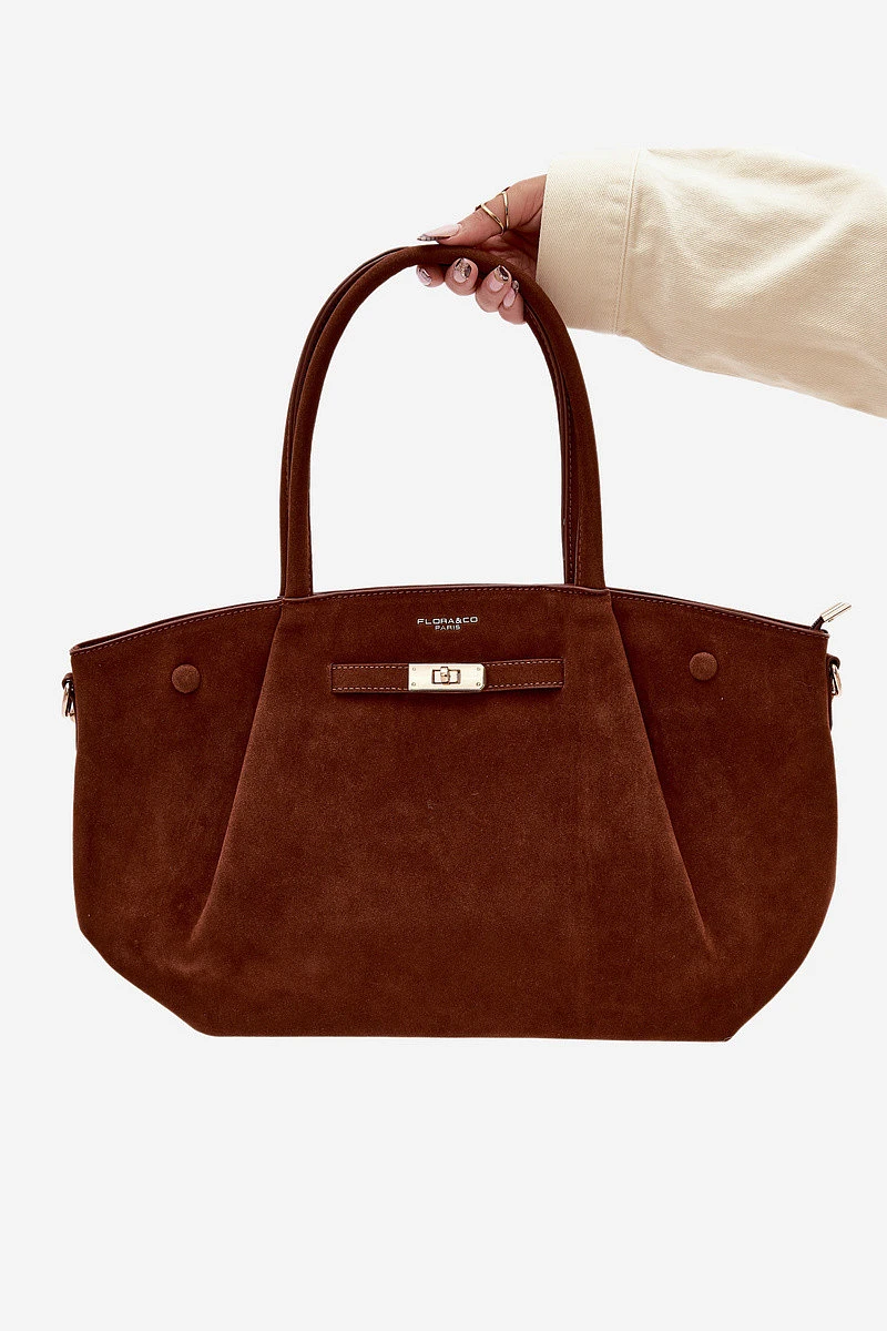 Dámská kabelka typu shopper vyrobená z imitace semiše je stylový a prostorný doplněk, ideální na každodenní nošení. Model má držadla a odnímatelný pásek, což umožňuje nošení kabelky různými způsoby – v ruce, na rameni nebo přes rameno. Zlaté kovové prvky dodávají eleganci. Vnitřek kabelky je prostorný a funkční – obsahuje tři praktické kapsy, které usnadňují organizaci a udržení pořádku. Šířka - 47 cm Výška - 27 cm Tloušťka - 8 cm.