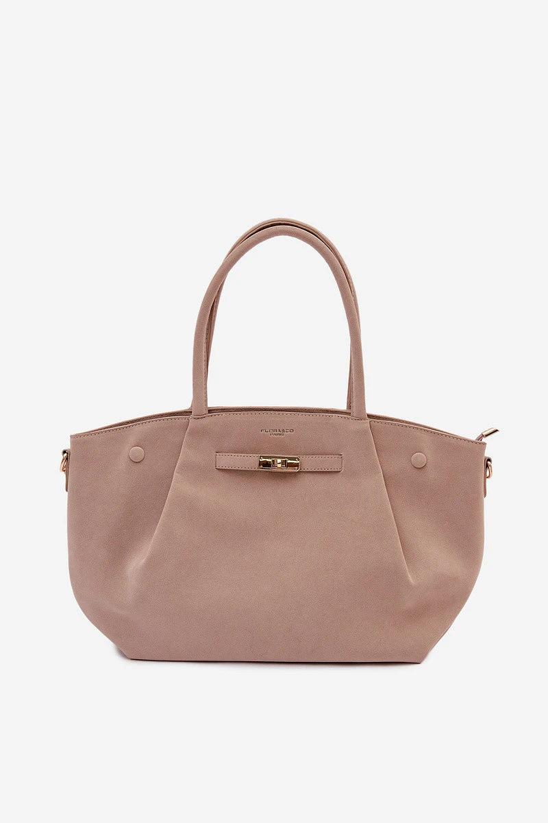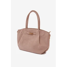 Dámská kabelka typu shopper vyrobená z imitace semiše je stylový a prostorný doplněk, ideální na každodenní nošení. Model má držadla a odnímatelný pásek, což umožňuje nošení kabelky různými způsoby – v ruce, na rameni nebo přes rameno. Zlaté kovové prvky dodávají eleganci. Vnitřek kabelky je prostorný a funkční – obsahuje tři praktické kapsy, které usnadňují organizaci a udržení pořádku. Šířka - 47 cm Výška - 27 cm Tloušťka - 8 cm.
