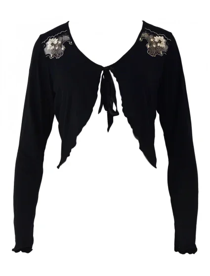Krátké bolérko s vlnitými okraji, dlouhý rukáv, zavazování na saténovou stužku, na ramenou zdobené průhlednou krajkou.