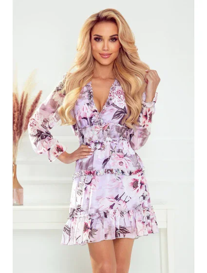 Jemné volánky dodávají na kráse celému modelu. Model je ušitý ze šifonu s podšívkou (95 % polyester, 5 % elastan) příjemného na dotyk. Tyto šaty značky Numoco jsou polským výrobkem a jsou k dostání se vzorem divokých růží. Limitovaná kolekce!