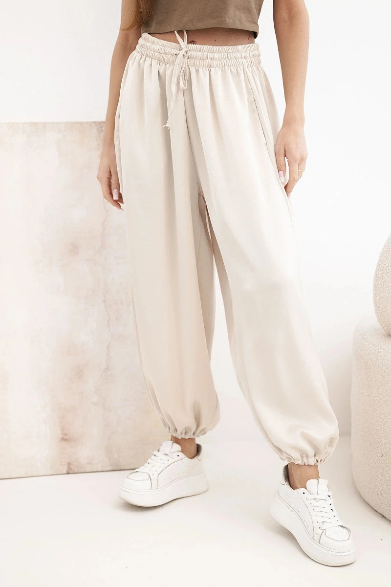 Široké dámské kalhoty s gumou v pase a šňůrováním typu aladinky béžové