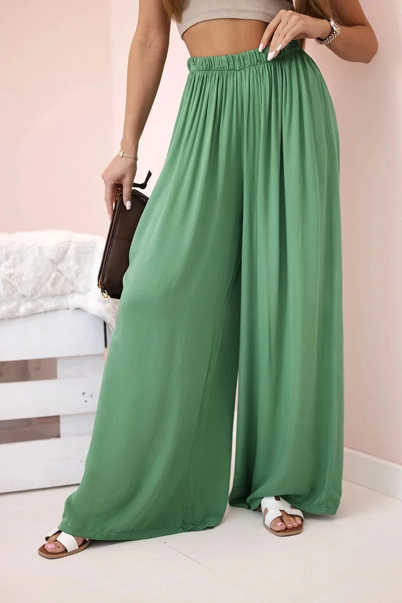 Široké dámské viskózové kalhoty s elastickým pasem zelené