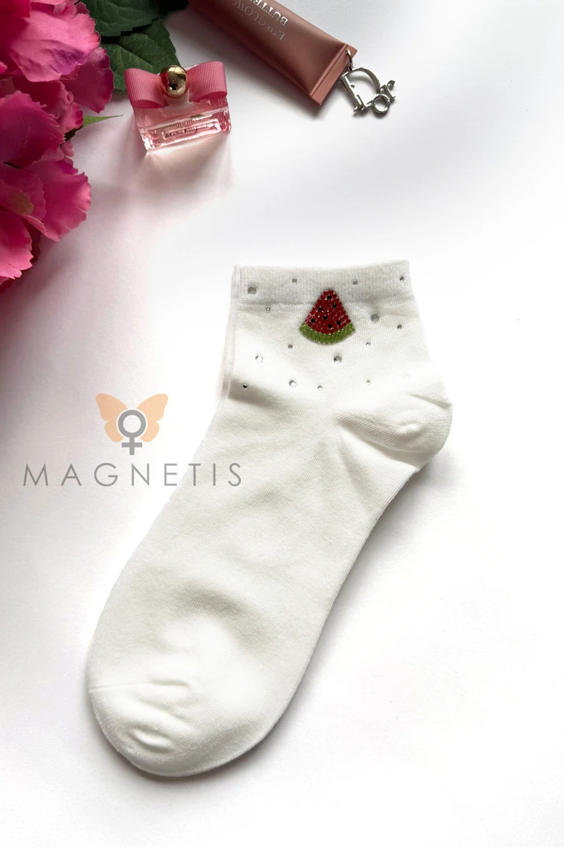 Skarpetki damskie Magnetis QR251116 01 z aplikacją to modny i kobiecy dodatek, który ożywi każdą stylizację. Klasyczny biały kolor został ozdobiony efektowną aplikacją w kształcie arbuza oraz subtelnymi, dekoracyjnymi kryształkami, które nadają całości świeżego i oryginalnego charakteru. To idealne skarpetki wzorzyste dla kobiet, które lubią modne detale i wyróżniające się akcenty. Wysoka zawartość bawełny (92%) zapewnia naturalną przewiewność, miękkość i komfort noszenia przez cały dzień. Dodatek elastanu (8%) gwarantuje elastyczność oraz idealne dopasowanie do stopy, dzięki czemu skarpetki nie zsuwają się i zachowują swój kształt nawet po wielokrotnym praniu. Materiał jest przyjemny dla skóry oraz odporny na deformacje. Model QR251116 01 doskonale sprawdzi się w stylizacjach casualowych, sportowych i miejskich. Świetnie komponuje się ze sneakersami, trampkami, balerinami czy loafersami. Skarpetki z aplikacją Magnetis to połączenie wygody, wysokiej jakości i modnego designu.