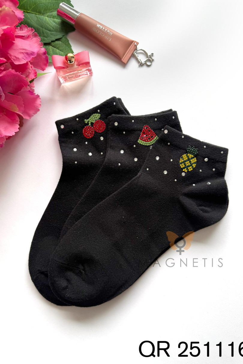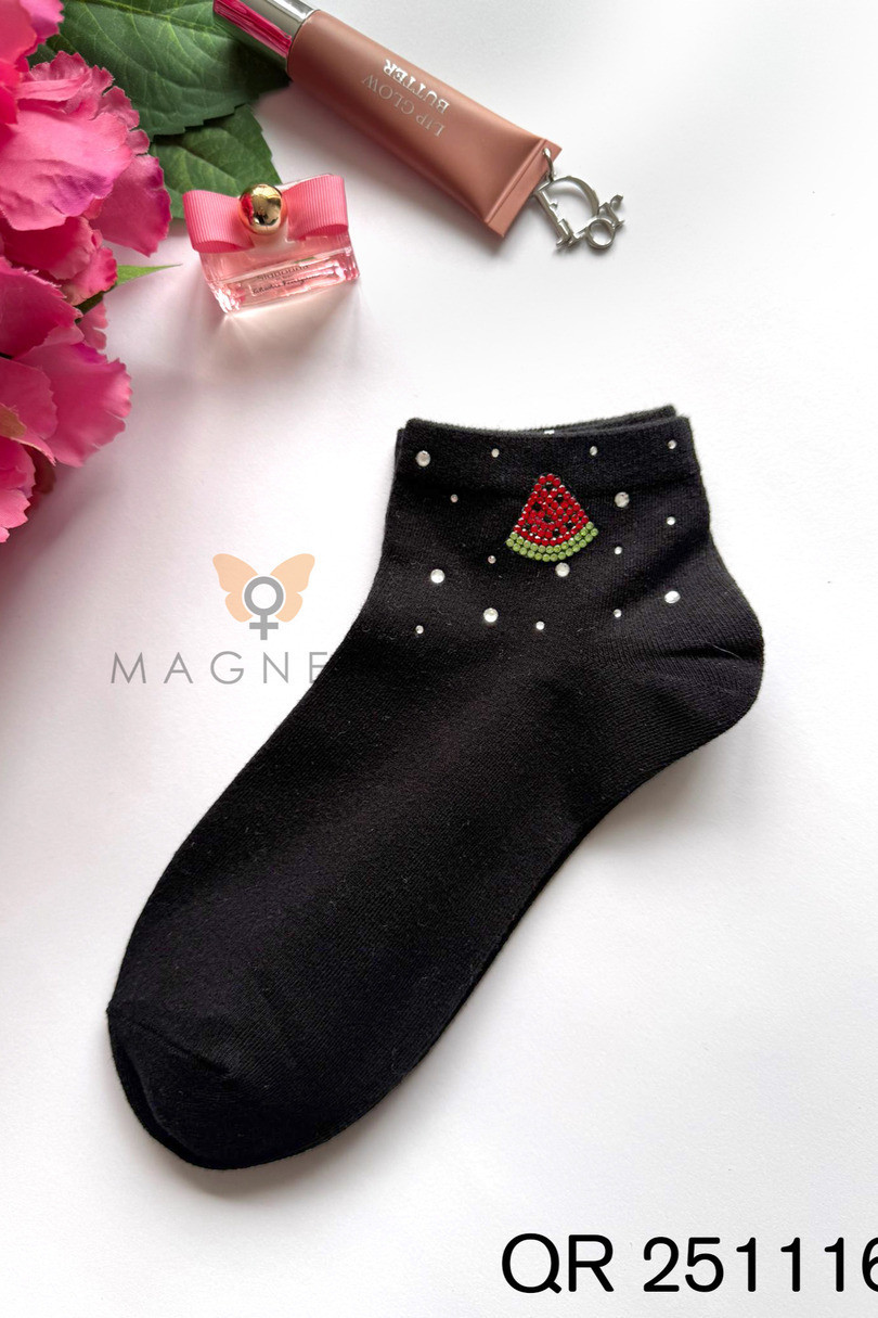 Skarpetki damskie Magnetis QR251116 04 z aplikacją to modny i oryginalny dodatek, który nada charakteru każdej stylizacji. Klasyczna czerń została ozdobiona efektowną aplikacją w kształcie arbuza oraz subtelnymi dekoracyjnymi elementami, które przyciągają wzrok i podkreślają kobiecy styl. To idealny wybór dla kobiet, które cenią modne, wzorzyste skarpetki z wyrazistym detalem. Wysoka zawartość bawełny (92%) zapewnia naturalną przewiewność, miękkość i komfort noszenia przez cały dzień. Dodatek elastanu (8%) gwarantuje elastyczność oraz idealne dopasowanie do stopy, dzięki czemu skarpetki nie zsuwają się i zachowują swój kształt nawet po wielokrotnym praniu. Materiał jest przyjemny dla skóry oraz odporny na deformacje. Model QR251116 04 doskonale sprawdzi się w stylizacjach casualowych, miejskich i sportowej elegancji. Świetnie komponuje się ze sneakersami, trampkami, loafersami czy botkami. Skarpetki z aplikacją Magnetis to połączenie wygody, jakości i modnego designu.