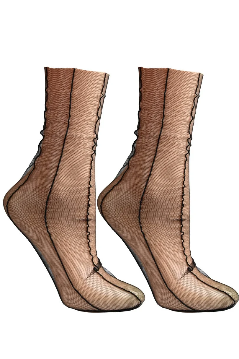 Cienkie skarpetki damskie wykonane z siateczki z podłużnymi cienkimi paseczkami w kształcie szwów to stylowy i nowoczesny dodatek do garderoby, który łączy elegancję z delikatnym, nieco odważnym designem. Siateczkowa struktura materiału nadaje im subtelnej przezroczystości, co dodaje lekkości i wyrafinowanego uroku. Paski przypominające szwy biegną pionowo wzdłuż skarpetek, tworząc iluzję przedłużenia nóg i podkreślając ich smukłość. Paski te są cienkie i równomiernie rozmieszczone, nadając całości eleganckiego, ale minimalistycznego charakteru. Ze względu na swoją przezroczystość i styl, te skarpetki świetnie sprawdzą się zarówno do eleganckich, jak i bardziej casualowych stylizacji, dodając im modnego, ale subtelnego wykończenia.