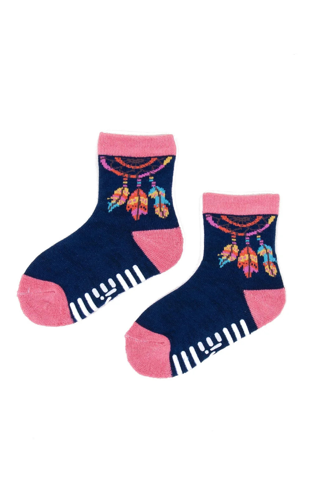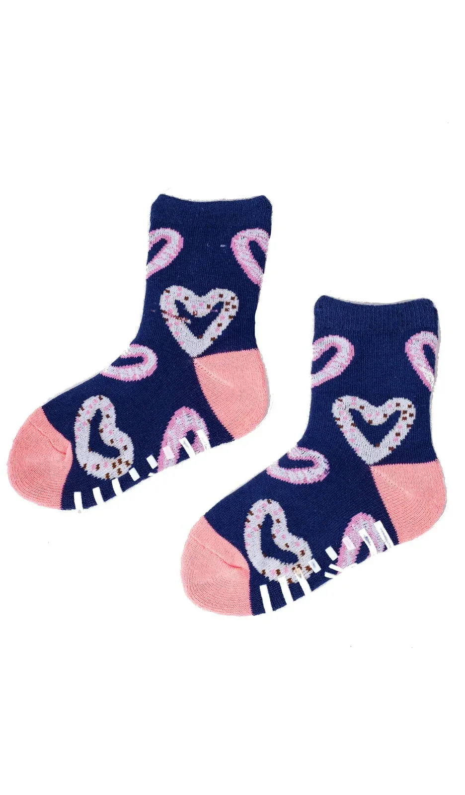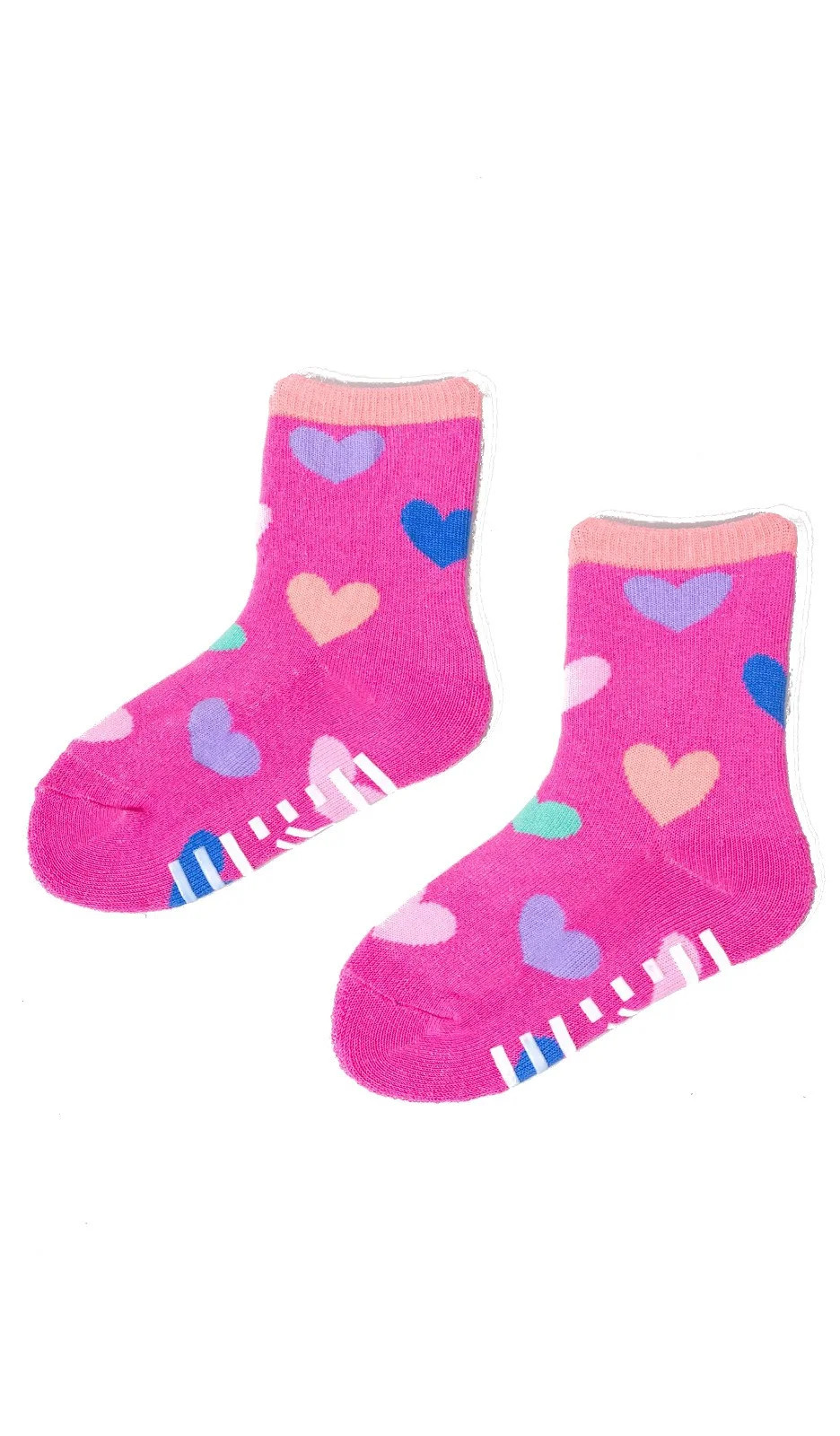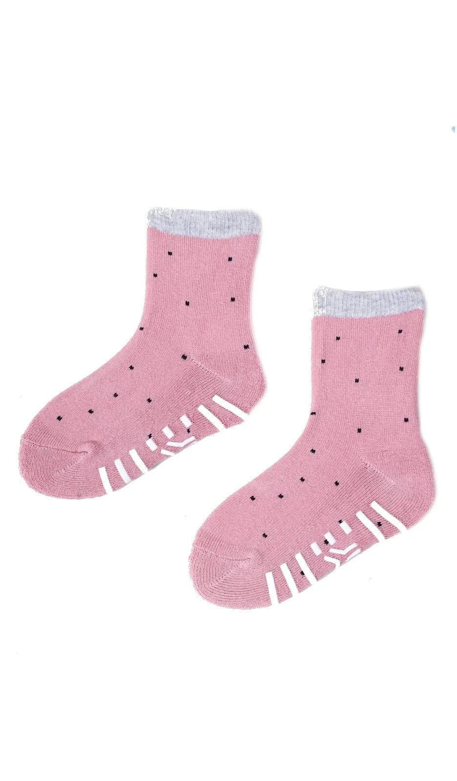 Kolorowe skarpetki dziewczęce, z ABS-em, od wewnętrznej strony w stopie- frota. Pakowane w foliowy woreczek po 6 par w kolorze róź pudrowy, grafitowy, granatowy.