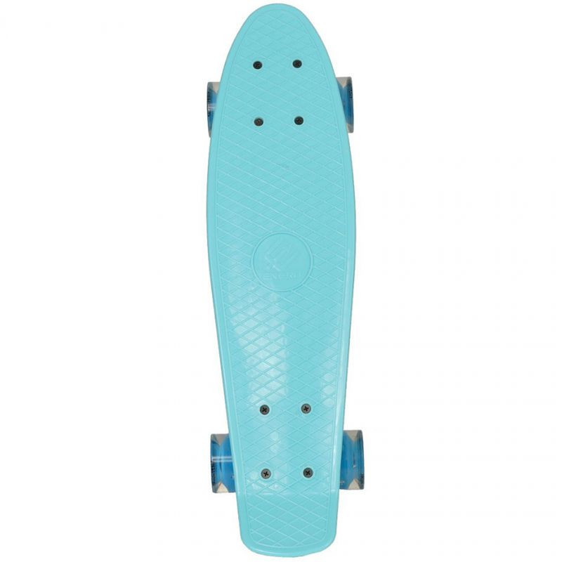 Modrý skateboard Enero určený pro děti i dospělé. Deska vyrobená z plastu. Protiskluzový povrch pro přilnavost při jízdě. Kolečka odolná proti poškození navíc svítí a zajišťují dobrou viditelnost po setmění.