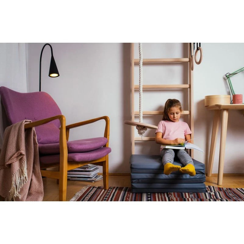 The gymnastic mattress is made of ecological materials. It has no odour. The cover of the mattress is eco-skin in shades of grey. The colour scheme fits perfectly into the décor of a child's room.