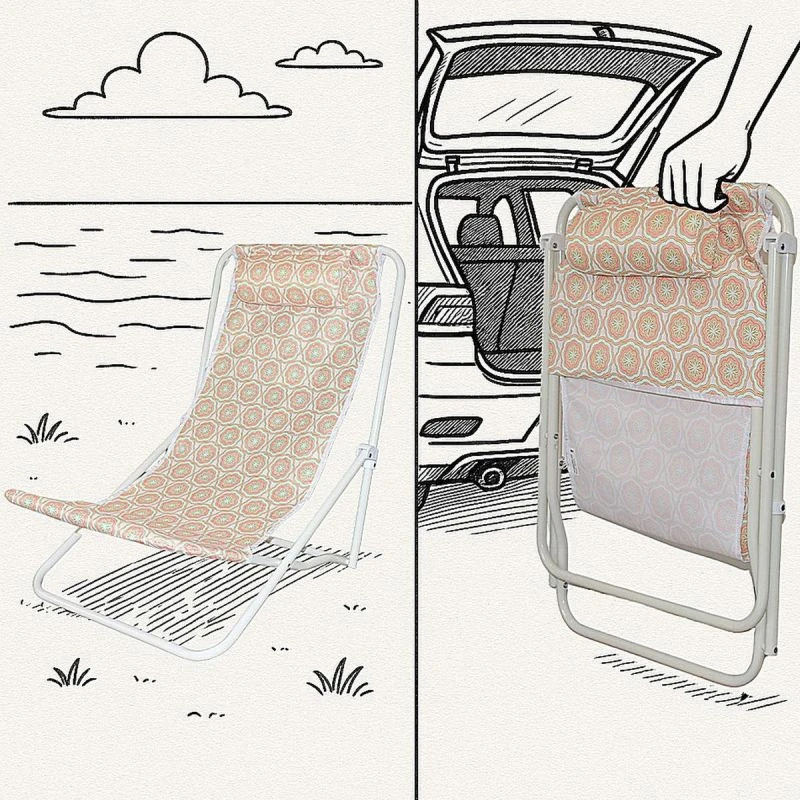 LEŻAK SKŁADANY PLAŻOWY Z ZAGŁÓWKIEM POMARAŃCZOWY to Twoja przepustka do błogiego odpoczynku – na plaży, w ogrodzie i gdziekolwiek chcesz złapać słońce. Rozkładasz, siadasz i… już jest dobrze!