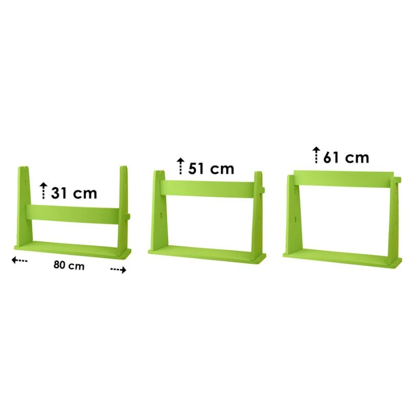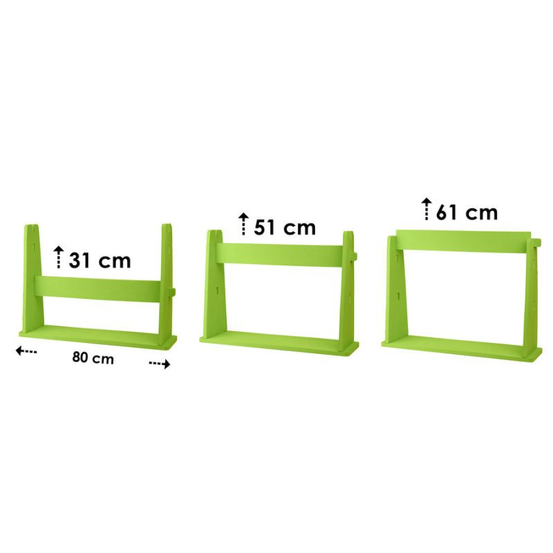 Překážku lze nastavit ve třech výškových úrovních (31 cm, 51 cm, 61 cm) a přizpůsobit tak intenzitu cvičení věku, dovednostem a potřebám účastníků. Skládací konstrukce usnadňuje přepravu a skladování překážky a jasně zelená barva zvyšuje její viditelnost na jakémkoli povrchu.