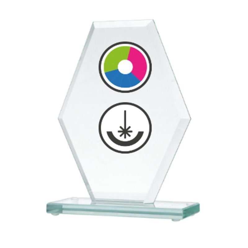 Skleněná trofej s barevným potiskem LuxorJet, gravírováním a inkoustovou výplní