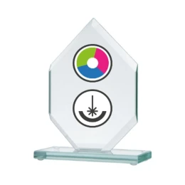 Skleněná trofej s barevným potiskem LuxorJet, gravírováním a inkoustovou výplní