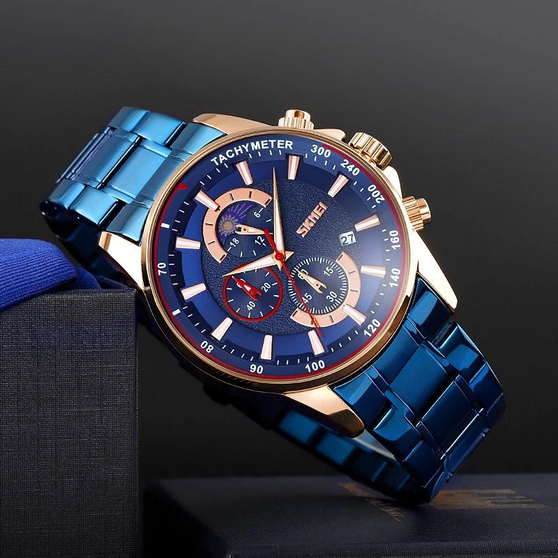 Náramky hodinek Skmei, vyrobené z nejkvalitnější nerezové oceli, v sobě spojují surovou pevnost s poutavou elegancí. Jejich robustní konstrukce je nejen symbolem spolehlivosti, ale také jistotou, že hodinky zůstanou pevně na zápěstí bez ohledu na výzvy dne. Přesné a bezpečné zapínání.