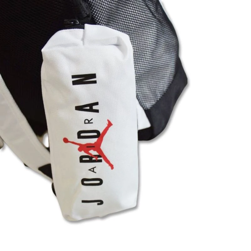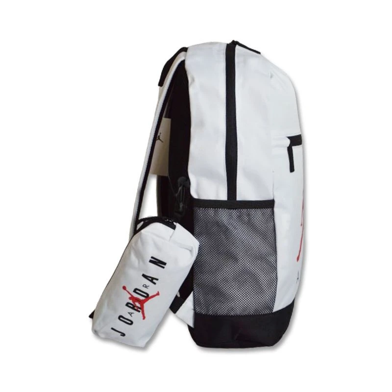 Batoh a penál jsou v bílém barevném provedení s černými nápisy Air Jordan a červeným logem Jumpman na přední straně.