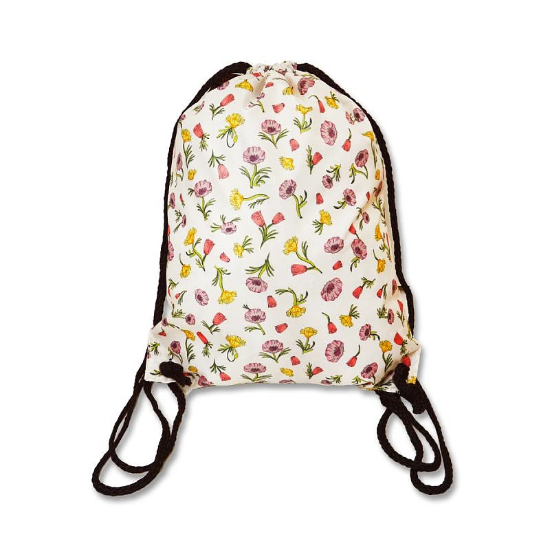 Batoh se stahovací šňůrkou je v bílé barvě s barevnou květinovou grafikou a celoplošným logem značky Vans.