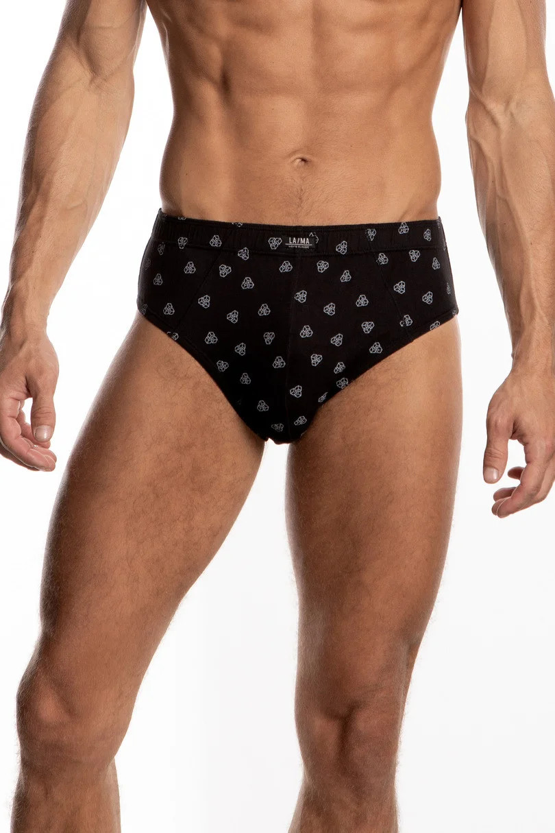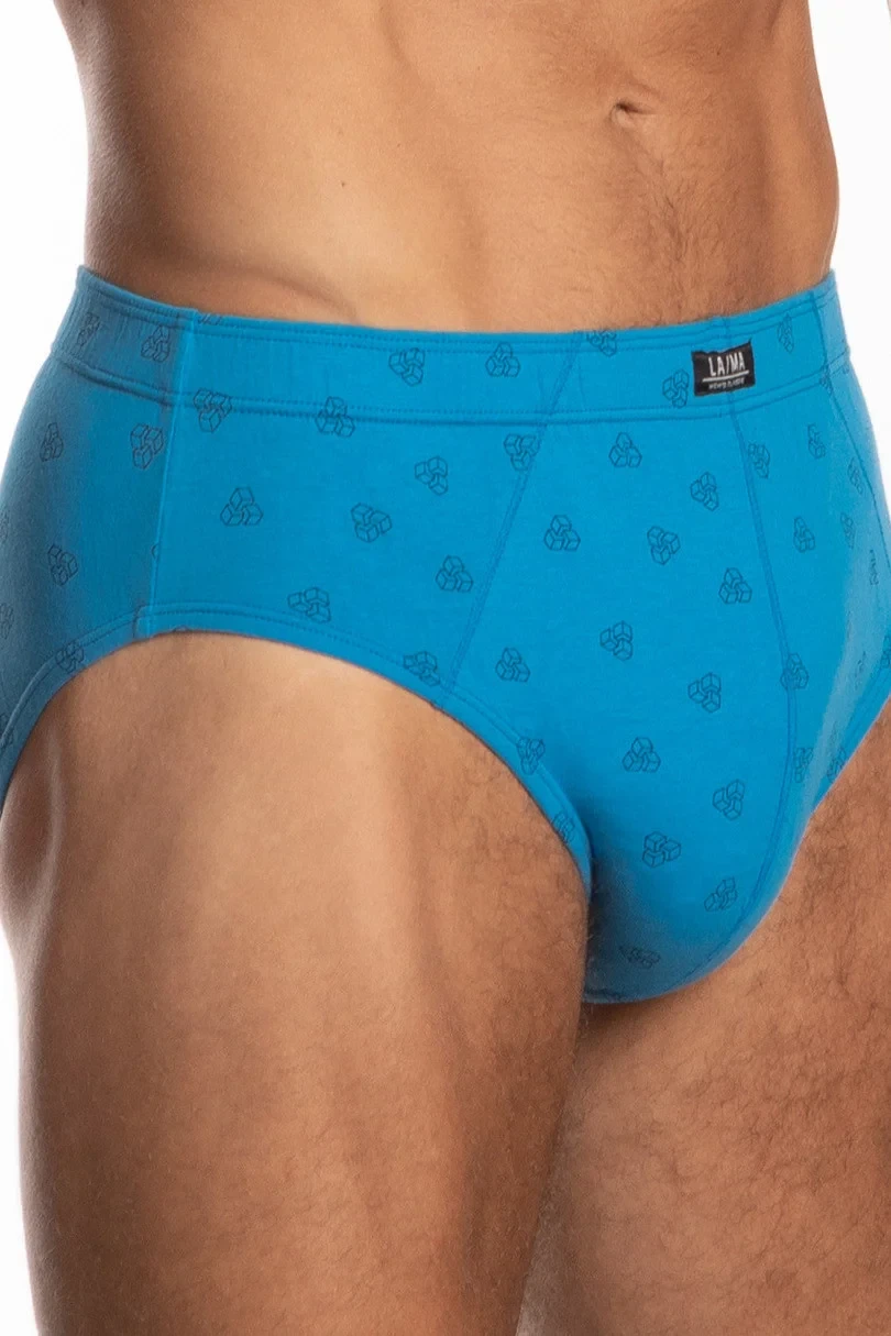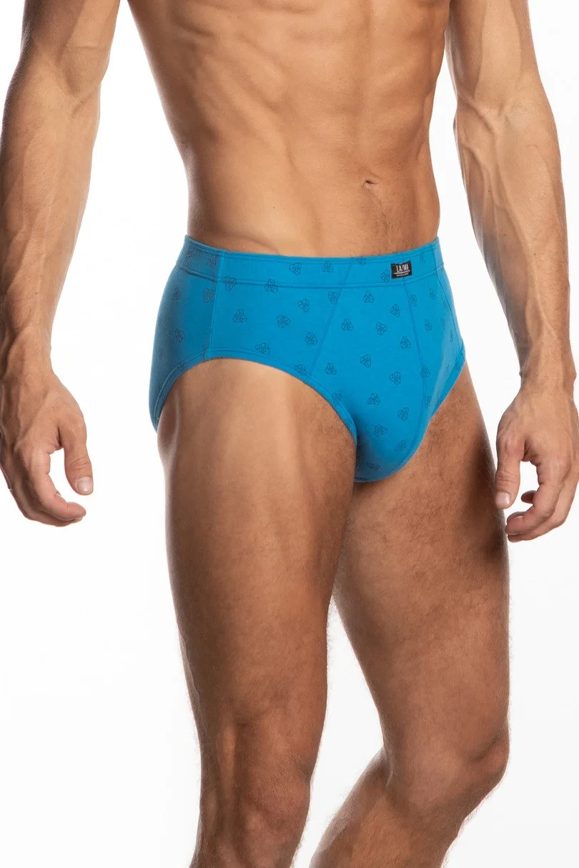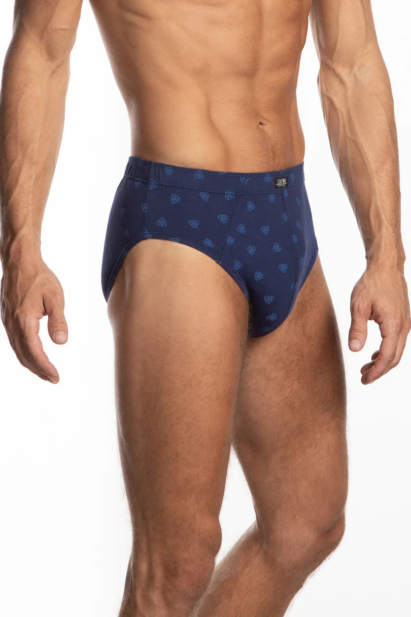Klasické pánské slipy, postavené boky, v pase pohodlná guma lemovaná bavlnou, balené v krabičce po třech kusech v prezentovaných barvách s jemným potiskem.