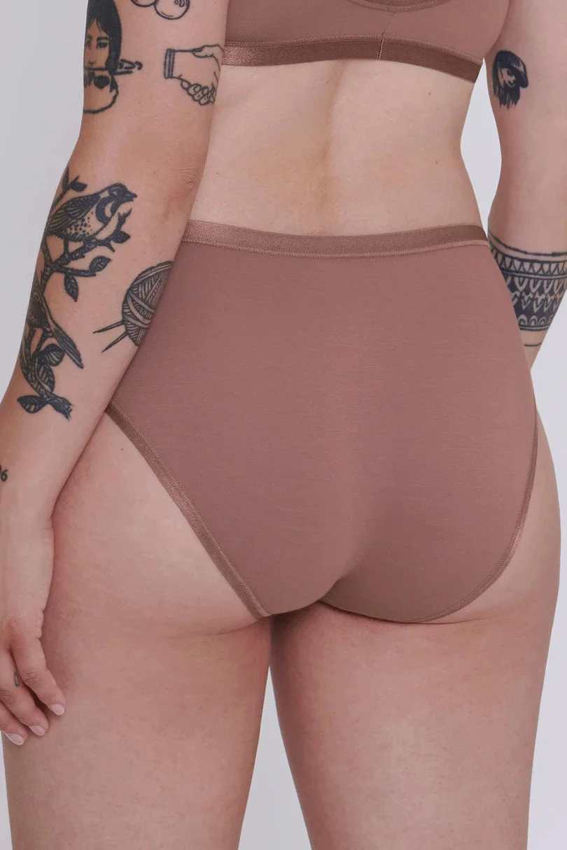 Kalhotky tai s vysokou nohavičkou. Kombinace velmi jemné bavlny Supima® a lesklého mikrovlákna. Elastické krajkové vsadky na nohavičkách.