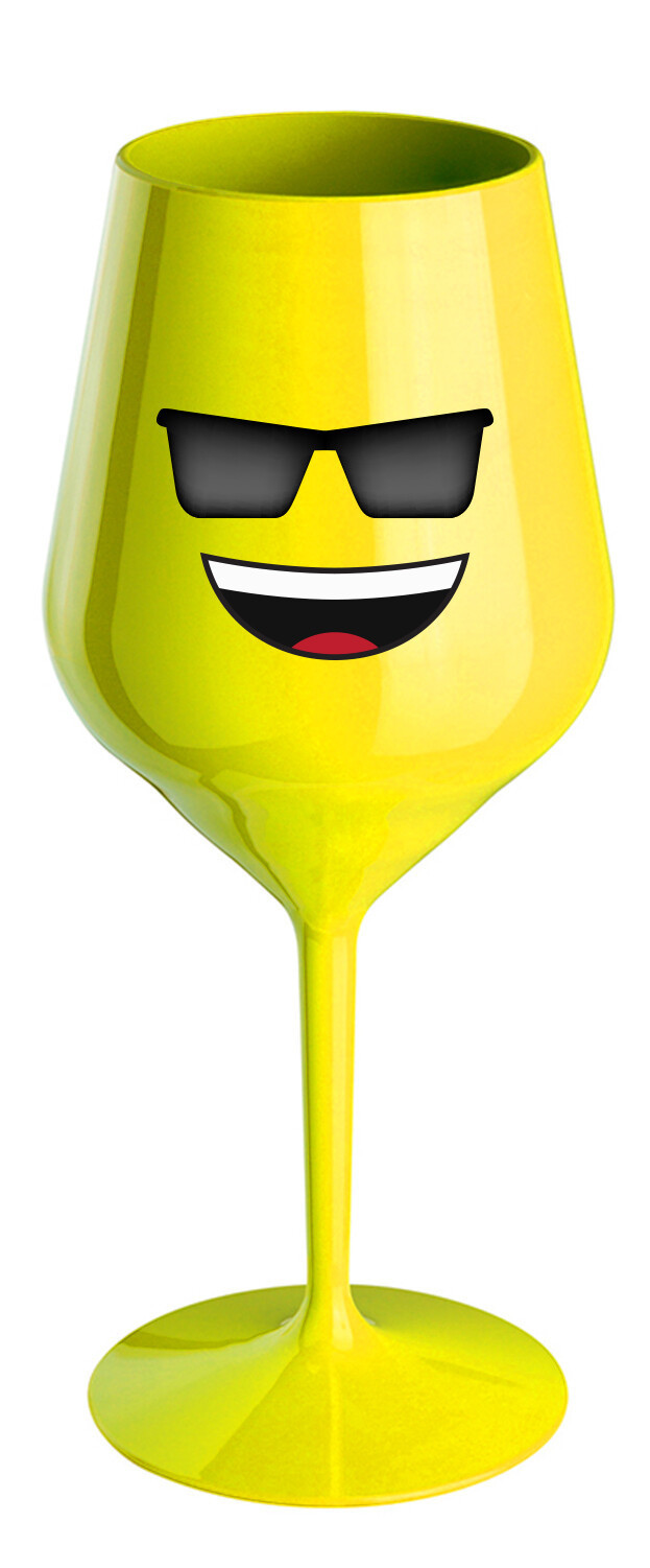 SMAJLÍK SE SLUNEČNÍMI BRÝLEMI - žlutá nerozbitná sklenice na víno 470 ml