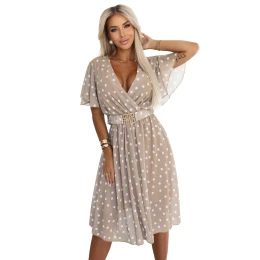 Béžové šaty s bílými puntíky ve stylu Marilyn Monroe jsou kvintesencí ženskosti a nadčasové elegance. Jsou vyrobeny z lehké šifonové látky, krásně padnou v pohybu a vytvářejí smyslnou a romantickou siluetu. Obálkový výstřih decentně zvýrazňuje poprsí, zatímco pružný pas s ozdobným páskem odhaluje ženské křivky.