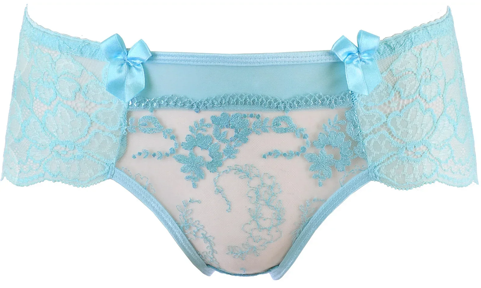 Smyslné spodní díly, které krásně obepínají linie ženských boků a hýždí, jsou vhodným letním modelem, který dodá vašemu stylingu lehkost a fantazii. Elastická modrá krajka zvyšuje pohodlí nositele. Střední část kalhotek tvoří třpytivá výšivka zdobená jemnými mašličkami. Kalhotky mají pohodlný a široký bavlněný klín.