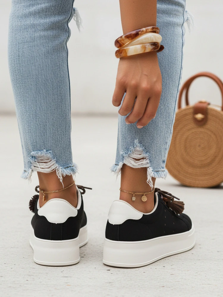 Sneakersy sprawdzą się w miejskich stylizacjach z jeansami, spodniami materiałowymi oraz sukienkami o luźnym kroju. Podwyższona podeszwa czyni je dobrym wyborem na aktywny dzień.