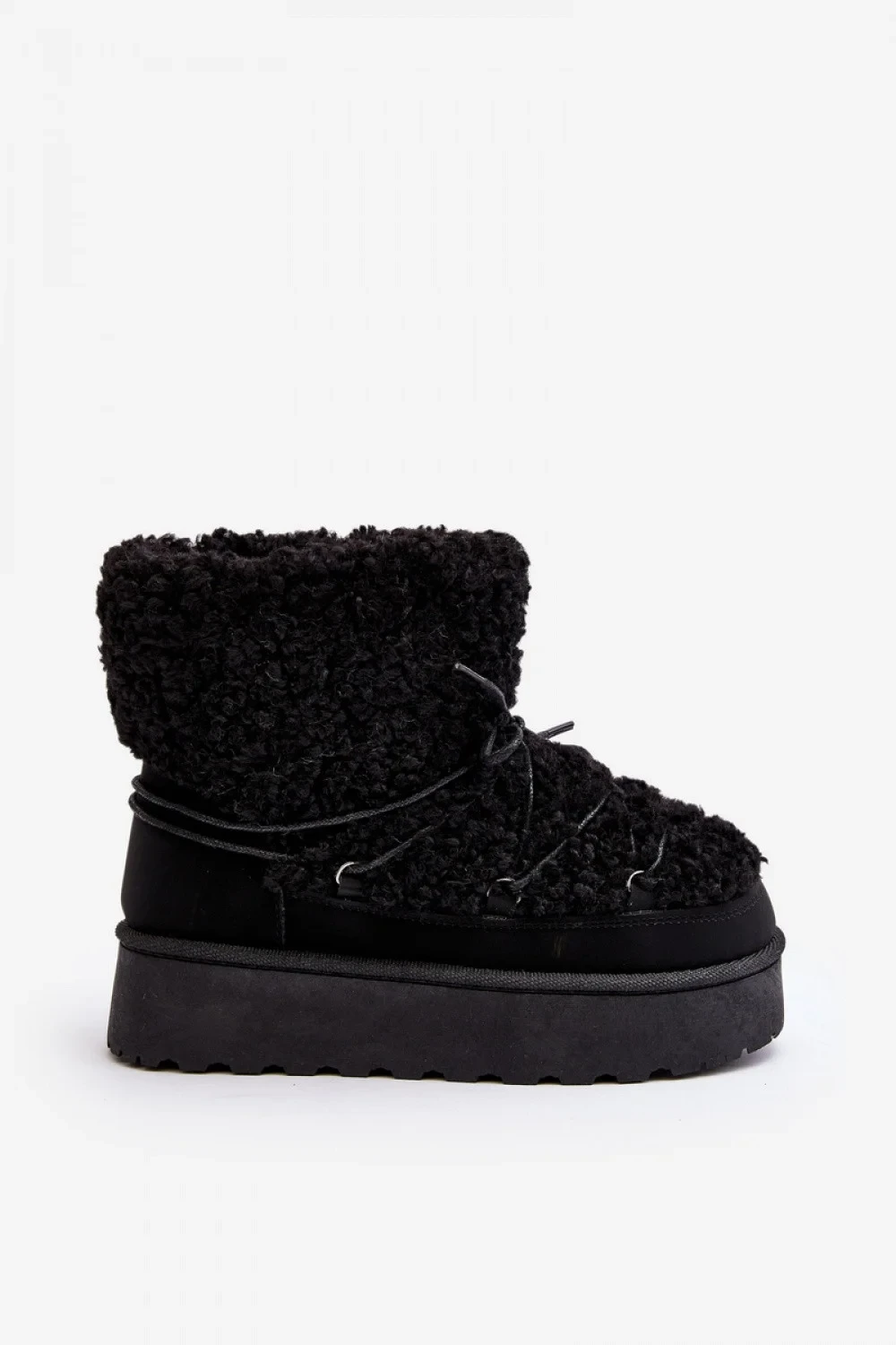 Dámské sněhule na pevné platformě z gumového materiálu. Uvnitř zateplené hustým kožíškem. Svršek s vázáním a syntetickou ovčí kůží. Ideální pro chladné zimní dny! Boty, které musíte mít!