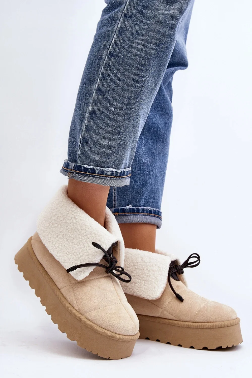 Dámské sněhule jsou ideální pro chladné dny. Jsou vyrobeny z ekologického semiše. Stojí na silné platformě. Zateplené ovčí kůží. Nazouvací model. Svršek zdobený vázáním.