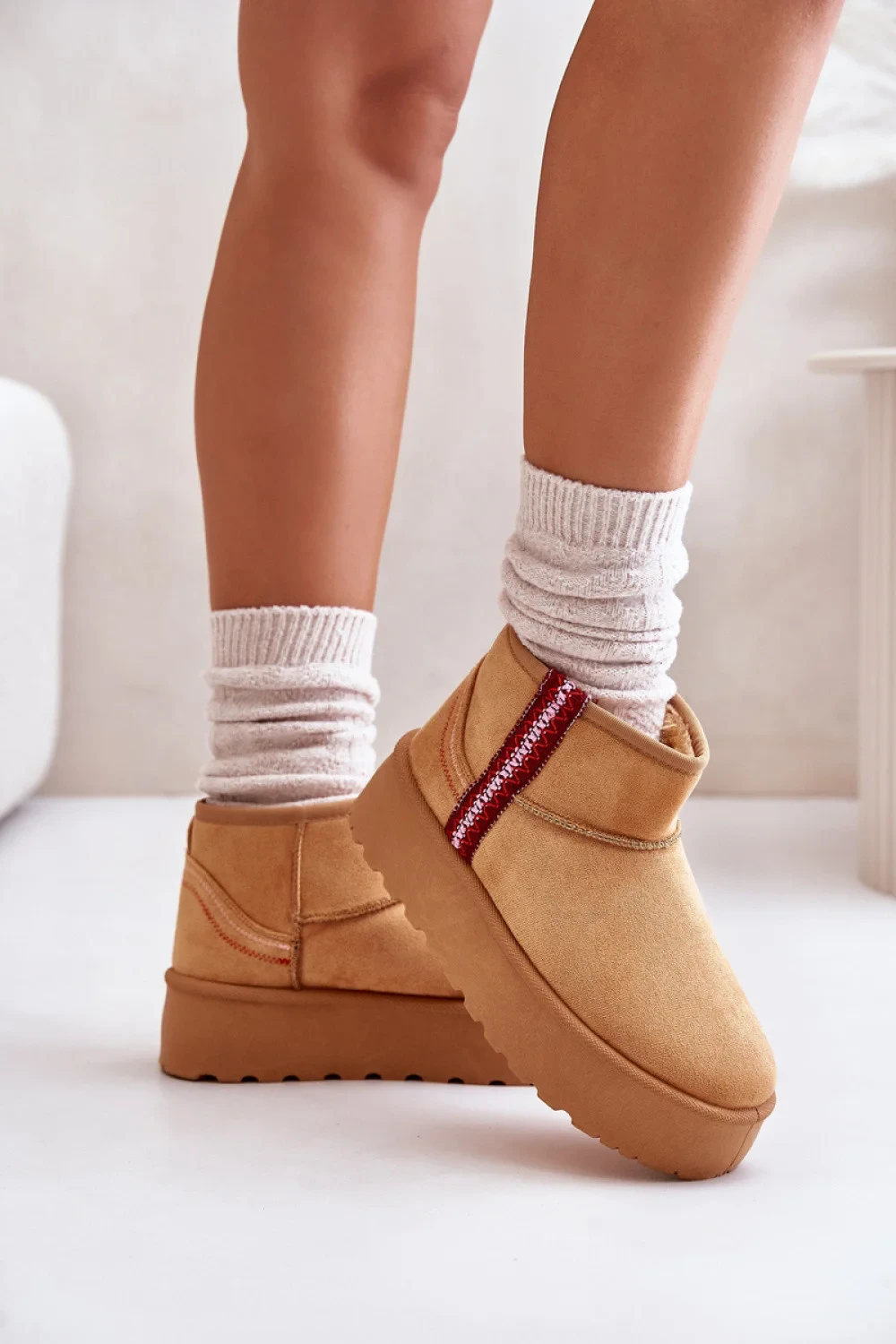 Dámské sněhule s módním vzorem na svršku. Vyplněné tlustým syntetickým kožíškem uvnitř. Vyrobené z ekologického semiše. Umístěné na masivní platformě z gumového materiálu. Svršek nad kotníkem. Ideální pro podzimně-zimní stylizace!