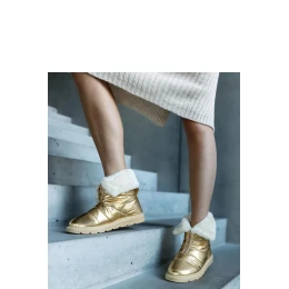 Zlaté zateplené sněhule s límečkem Edidda jsou ideální obuví na zimu, která kombinuje funkčnost s módním designem. Jejich pevné šití a kulatá špička zaručují odolnost a pohodlí při nošení po dlouhou dobu. Díky zateplení vnitřku zůstanou nohy teplé i v největších mrazech. Sněhule mají zapínání na zip, co usnadňuje jejich obouvání a svlékání. Vnější materiál je vyroben z látky a podrážka je vyrobena z gumy ve zlaté barvě. Tyto sněhule určitě zajistí, že budete vypadat stylově a cítit se pohodlně po celou zimu. Ideální na podzim a zimu.