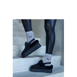 Černé pantofle na platformě zdobené kožešinou a s pružným páskem na patě Frank jsou ideální volbou pro chladné podzimní a zimní dny. Jejich inovativní design v kombinaci s hřejivou izolací z nich dělá nejen stylové, ale také funkční boty. Kulatá špička jim dodává na eleganci, zatímco nazouvací provedení zaručuje pohodlné nošení. Vnější materiál je vyroben z odolné tkaniny a gumová podrážka zajišťuje jistý krok. Tyto pantofle budou dokonalým doplňkem každé zimní stylizace a dodají jí charakter a originalitu.