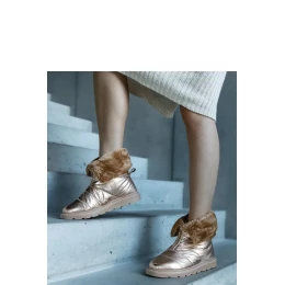 Zlaté zateplené sněhule s límcem Edidda jsou ideální obuví na zimu. Jejich kulatá špička poskytuje pohodlí a volnost pohybu, zatímco vysoký svršek zaručuje teplo i v těch nejchladnějších dnech. Díky módnímu designu jsou ideální do města i na lyže. Gumová platforma navíc zajišťuje stabilitu a pohodlí při chůzi. Tato obuv kombinuje styl s funkčností a je ideální pro ženy, které si cení pohodlí a módního vzhledu. K dostání ve zlaté barvě, se zapínáním na zip. Ideální na podzim a zimu.