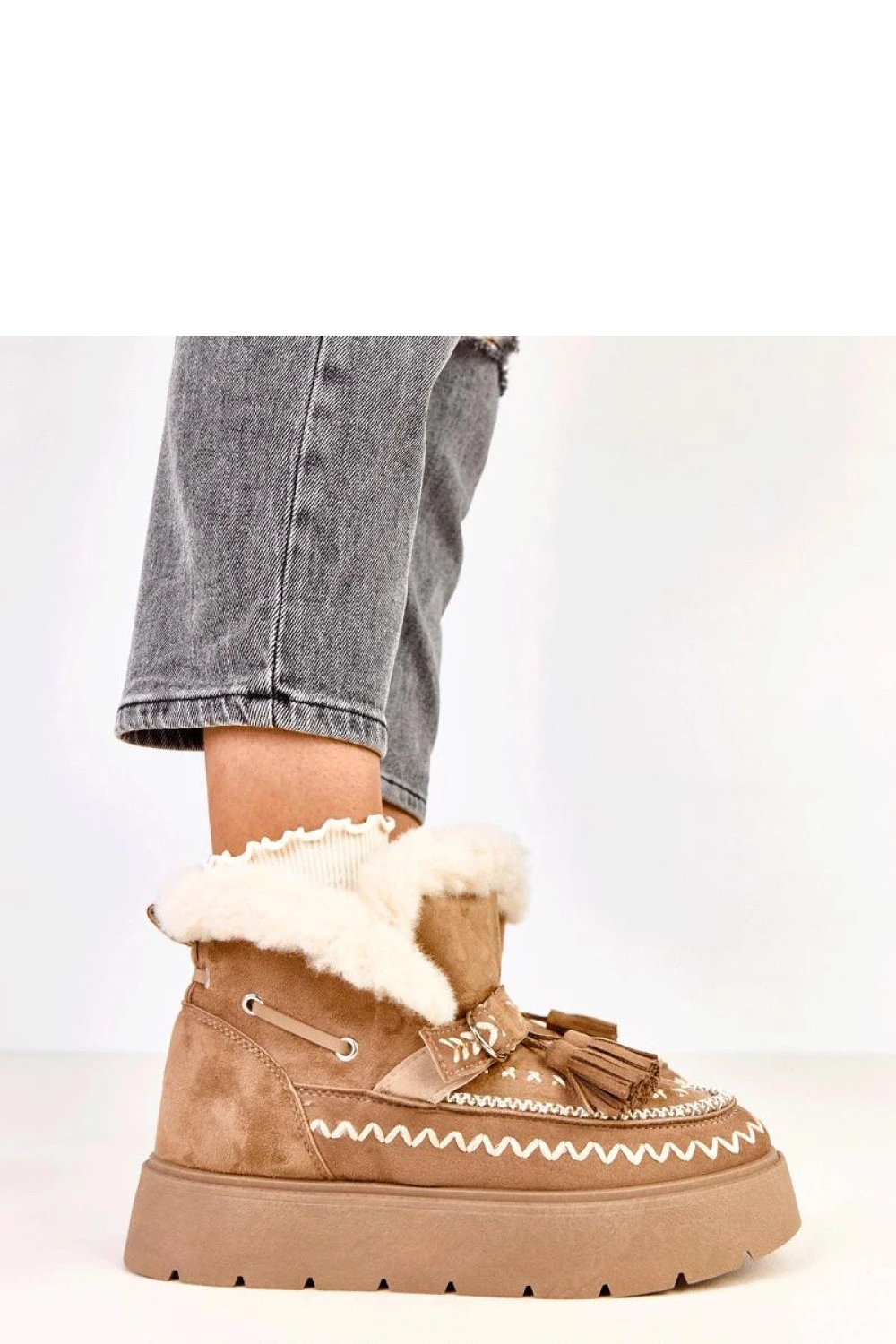 Sněžné boty s nápadnými řasami jsou kombinací pohodlí, tepla a stylového vzhledu, ideální na zimní dny. Vyrobené z ekologické semišové kůže, působí elegantně a zároveň jsou odolné proti každodennímu používání. Model má kulatou špičku a je vystlaný kožešinou, což zajišťuje tepelný komfort i v nejchladnějších dnech. Stylové ozdobné řasy dodávají botám charakter a lehkost, dávají jim módní, neformální vzhled. Platforma o výšce 4 cm stabilizuje postavu, a vložka z umělého kožešinového materiálu zaručuje dodatečné teplo a měkkost. Díky natahovací konstrukci jsou boty pohodlné a rychlé při obouvání, ideální pro každodenní, zimní stylizace.