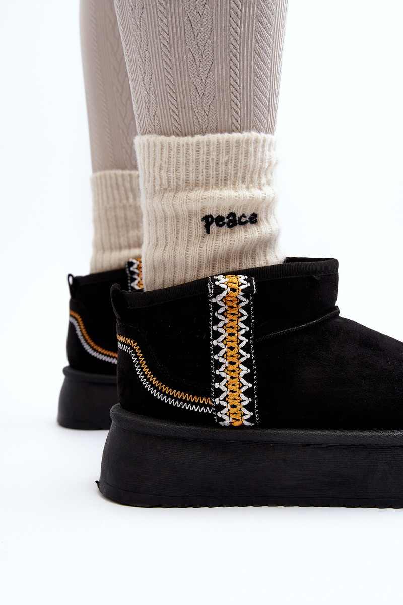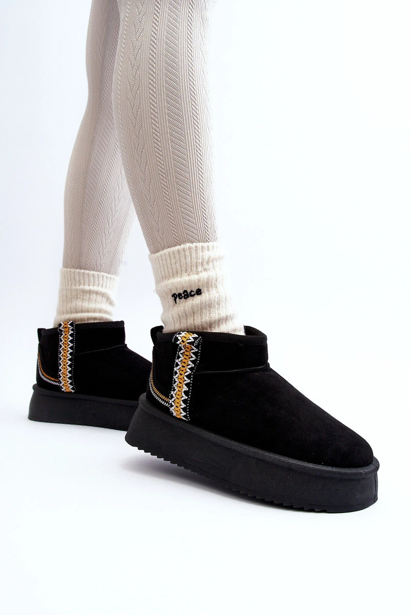 Sněhule na platformě jsou nejmodernější střih této sezóny! Tento model je vyroben z ekologického semiše. Silná podrážka z pryžového materiálu skvěle izoluje od chladného povrchu. Kotníková část je zdobená aztéckým vzorem. Uvnitř je vyloženo kožešinou. Určitě si je musíš pořídit! Při výběru velikosti se řiďte tabulkou velikostí.