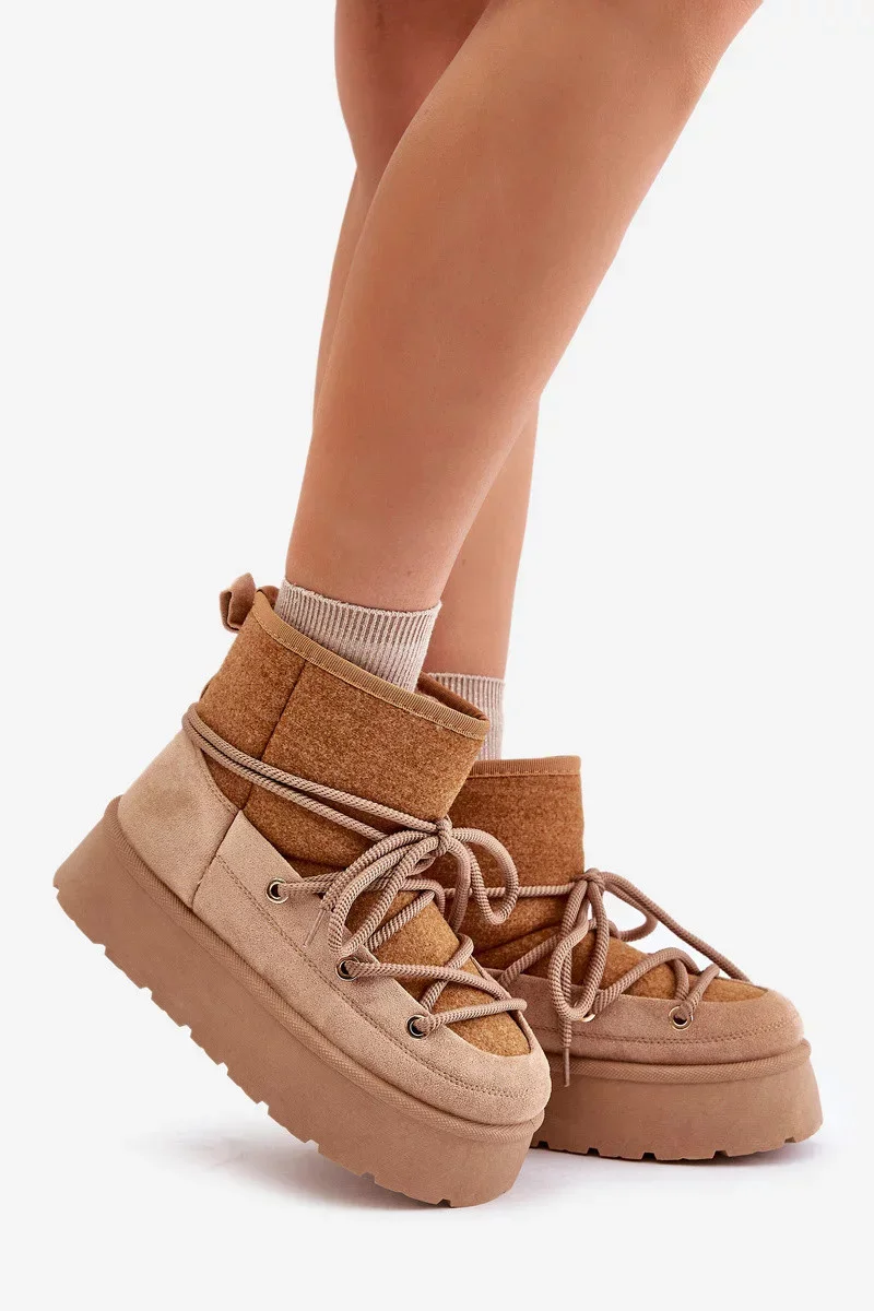 Stylové sněhule na platformě jsou ideální kombinací módy a pohodlí. Mají praktické šněrování vpředu, které zajišťuje dobré přizpůsobení noze. Vnitřek zateplený kožíškem zaručuje teplo v mrazivých dnech. Pohodlné a teplé, skvěle se hodí jak na každodenní nošení, tak i na zimní procházky. Při výběru velikosti se prosím řiďte tabulkou velikostí.