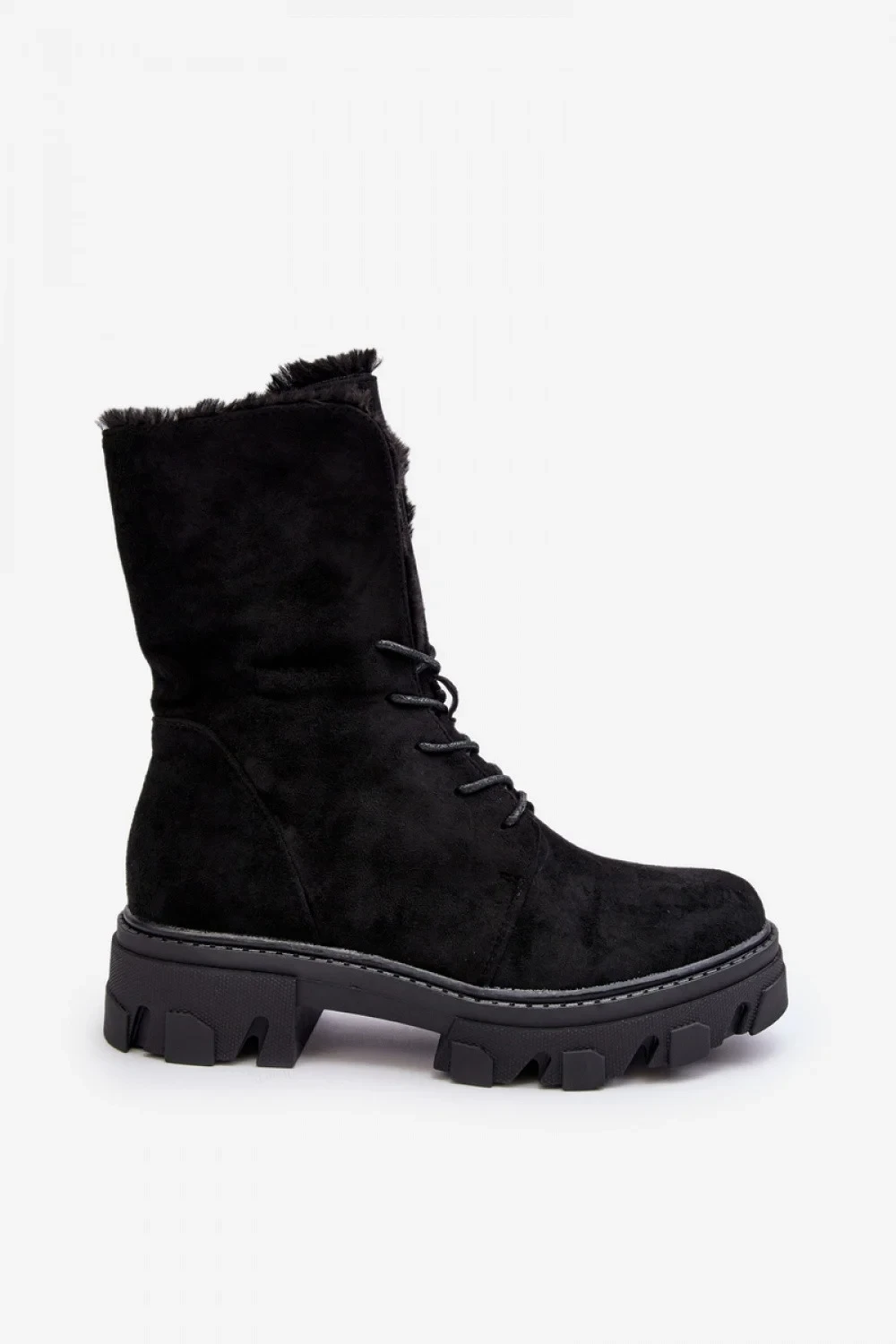Dámské boty jsou vyrobeny z ekologického semiše příjemného na dotek. Jsou zateplené přikrývkou na boty a kožešinou. Osazené na plochém podpatku a platformě. Zaoblená špička, zpevněná pata. Nazouvací model se šněrováním.