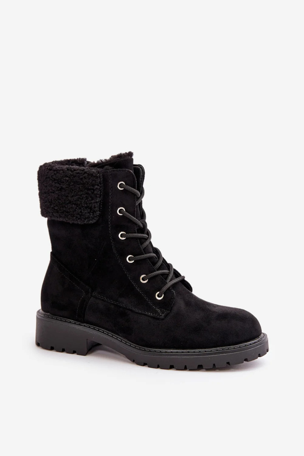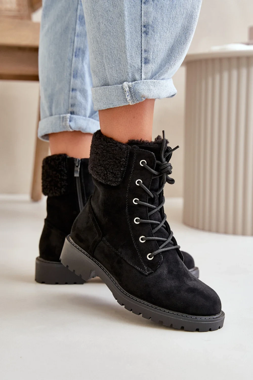 Dámské botky vyrobené z měkkého ekologického semiše. Vnitřek je vyložen kožíškem, což zajišťuje pohodlí v chladnějších dnech. Horní část je zdobena stylovým kožíškem. Model se šněrováním a s přídavným zipem, což usnadňuje obouvání a přizpůsobení se noze. Ideální na podzimní a zimní procházky a každodenní outfit.