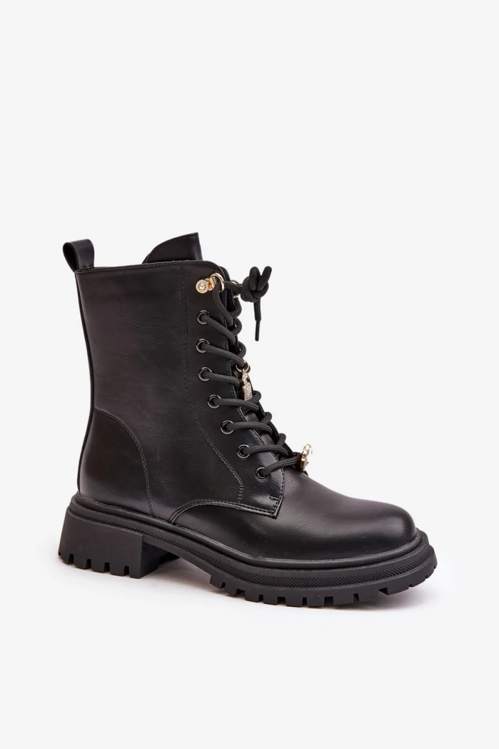 Dámské botky vyrobené z ekologické kůže. Osazené na ploché podrážce. Zaoblené špičky. Zapínání na zip z boku pro snadné obutí, a další šněrování s roztomilými ozdobami dodávají botkám zvláštní kouzlo. Ideální na podzimní a zimní stylizace, skvěle se kombinují s různými sestavami na chladnější dny.