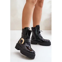 Výjimečné boty z přírodní kůže. Stojí na platformě a plochém podpatku a zajišťují stabilitu a pohodlné nošení. Model na zip je navíc vybaven šněrováním pro lepší přizpůsobení. Velká přezka s páskem na svršku je výrazným detailem, který jim dodává módní, osobitý charakter.