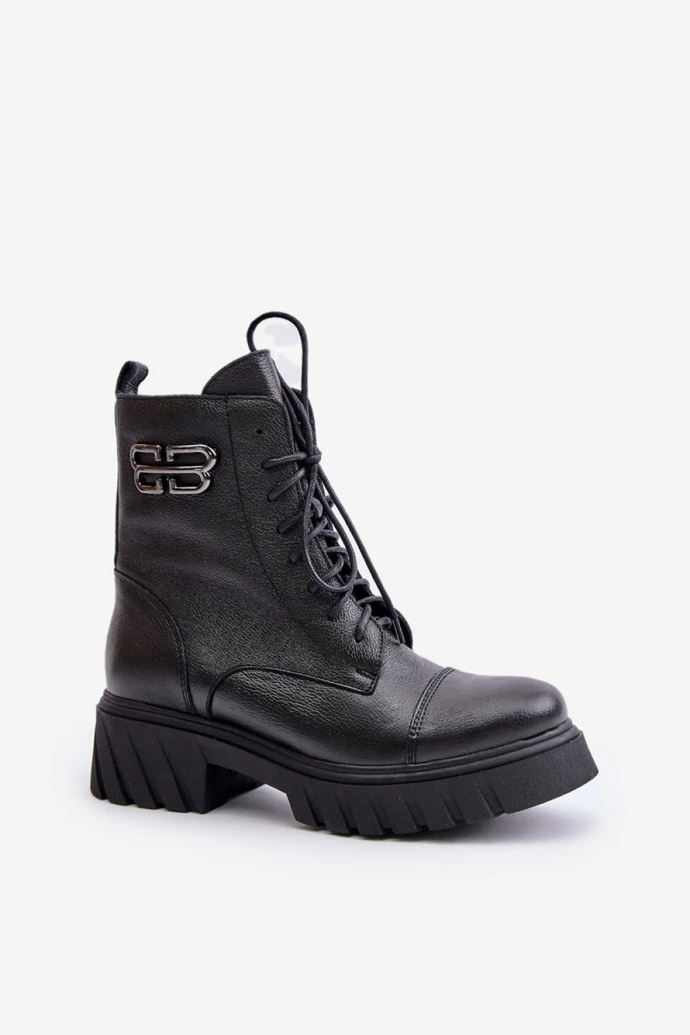 Dámské boty z přírodní kůže. Stojí na masivním plochém podpatku a platformě. Vybaveny šněrováním i zipem pro pohodlné nošení a přiléhání k noze. Ozdobný zlatý detail na boku svršku dodává eleganci. Vnitřní prostor zateplený přikrývkou na boty. Tyto boty, ideální pro podzimní a zimní stylizaci, spojují eleganci s funkčností.