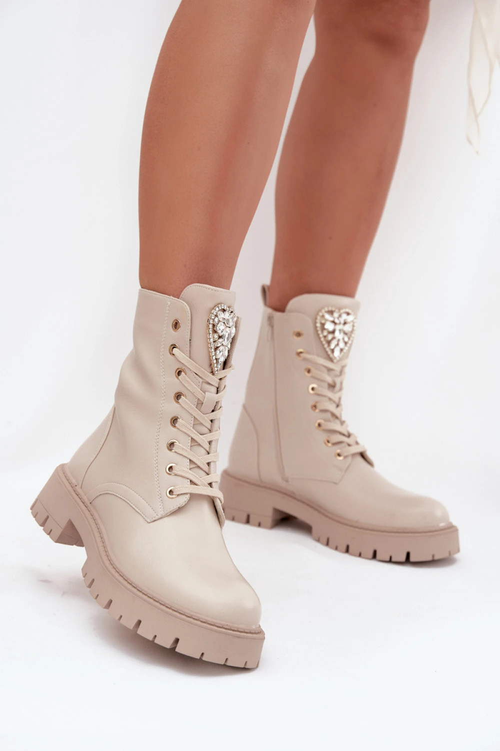 Dámské boty z ekokože jsou roztomilým návrhem spojujícím pohodlí s módním detail. Model se šněrováním a zipem zajišťuje snadné obutí a ideální přizpůsobení noze, a ozdobné srdce s krystalky na jazyku dodává jemný ženský lesk, skvěle doplňující každodenní outfit. materiál koženka