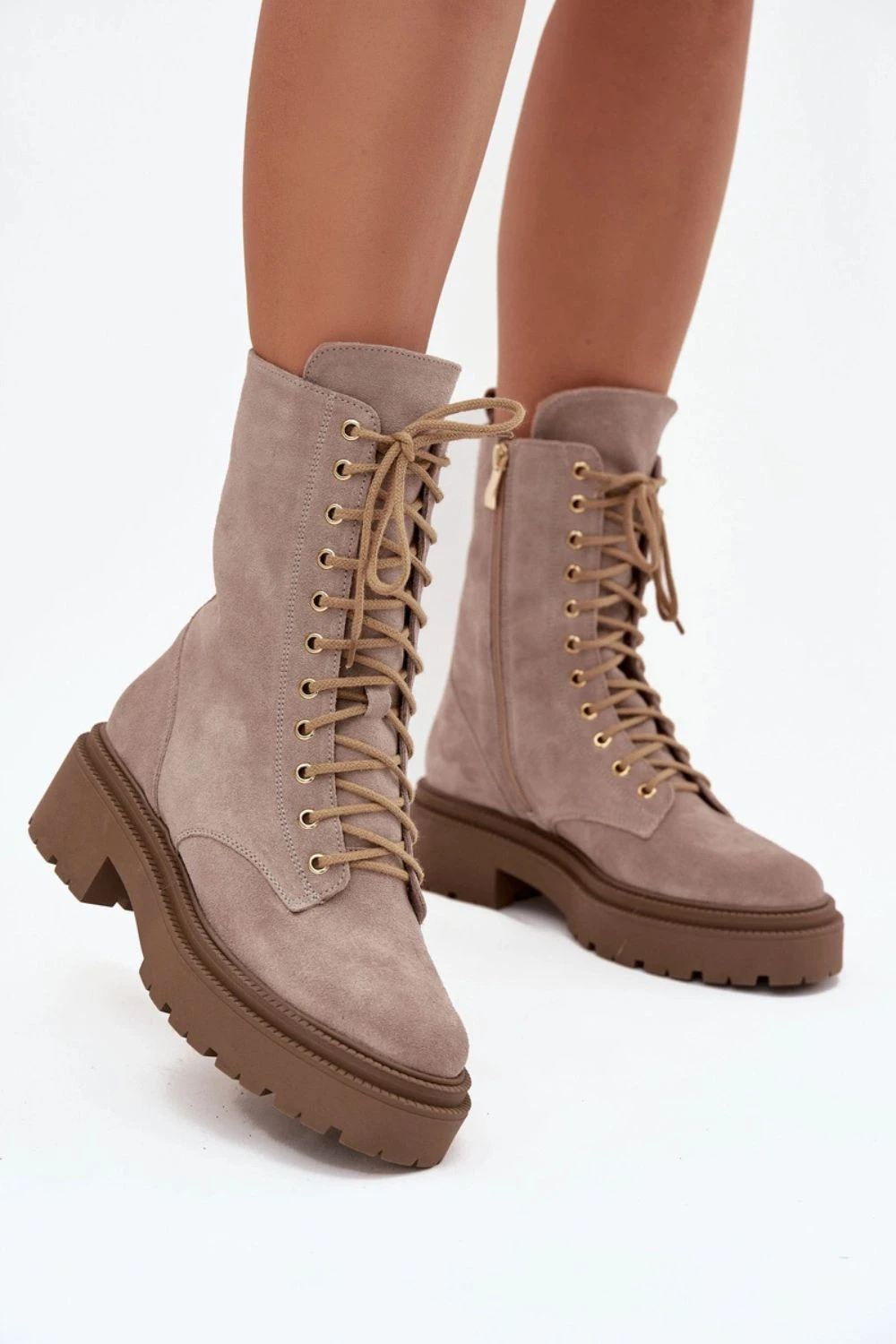 Botky pracovní dámské vyrobené z přírodního semiše jsou ideální volbou pro ženy, které ocení styl a pohodlí v každodenní obuvi. Měkká, příjemná na dotek kůže jim dodává elegantní charakter. Umístěné na masivní platformě s plochým podpatkem poskytují stabilitu a pohodlí při nošení, zaoblené špičky jim dodávají klasický, nadčasový vzhled. Vnitřek je vyztužen, což zajišťuje, že boty skvěle chrání před chladem v podzimní-zimní sezóně. Model kombinuje šněrování s uzavíráním na zip, díky čemuž je nejen módní, ale také funkční, snadno se obouvá a dobře se přizpůsobuje noze. Jsou to boty, které se skvěle hodí do každodenních stylizací, zdůrazňující moderní charakter každého outfitu.