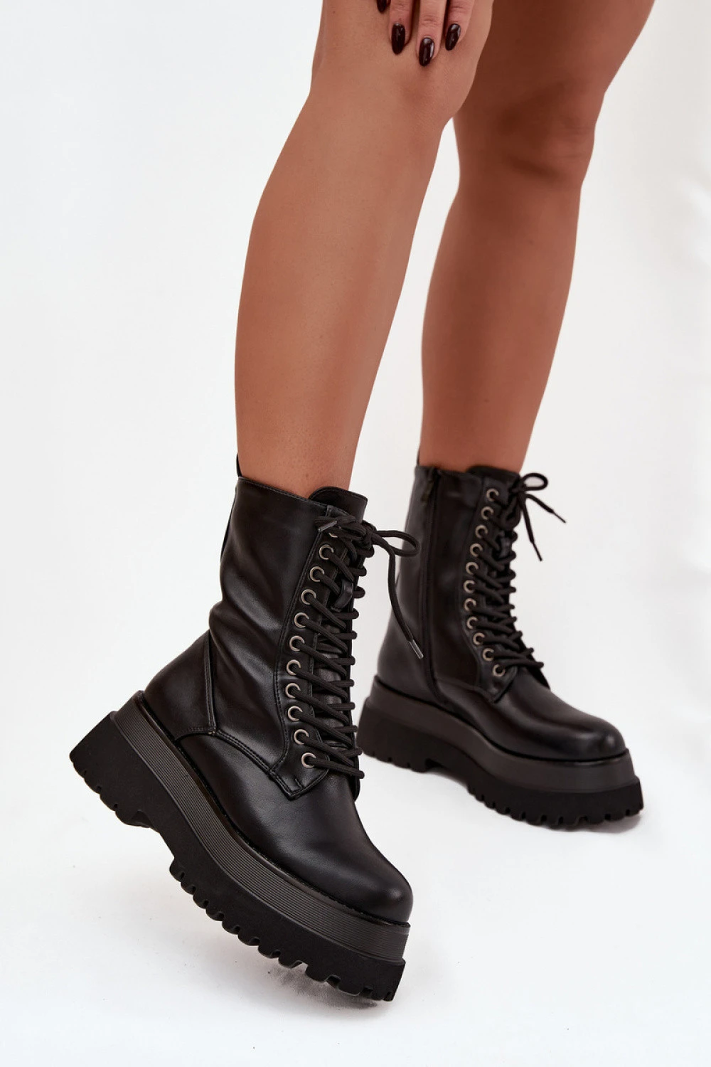 Botky workery dámské vyrobené z ekokože jsou ideální kombinací stylu a pohodlí. Model umístěný na masivní platformě, která jim dodává výrazný charakter a moderní vzhled. Šněrovací a zapínací na zip, skvěle se přizpůsobují noze a zajišťují pohodlné obouvání. Vnitřek bot je vyztužen pěnou pokrytou látkou, co zaručuje teplo a pohodlí v chladnějších dnech. Jedná se o módní a praktický model, který skvěle padne do každodenních stylizací.