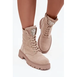 Dámské botky z ekosuede jsou roztomilým návrhem spojujícím pohodlí s módním detail. Model se šněrováním a zipem zajistí snadné obouvání a ideální přizpůsobení noze, a ozdobné srdce s krystalky na jazyku dodává jemný ženský lesk, skvěle doplňující každodenní outfit.