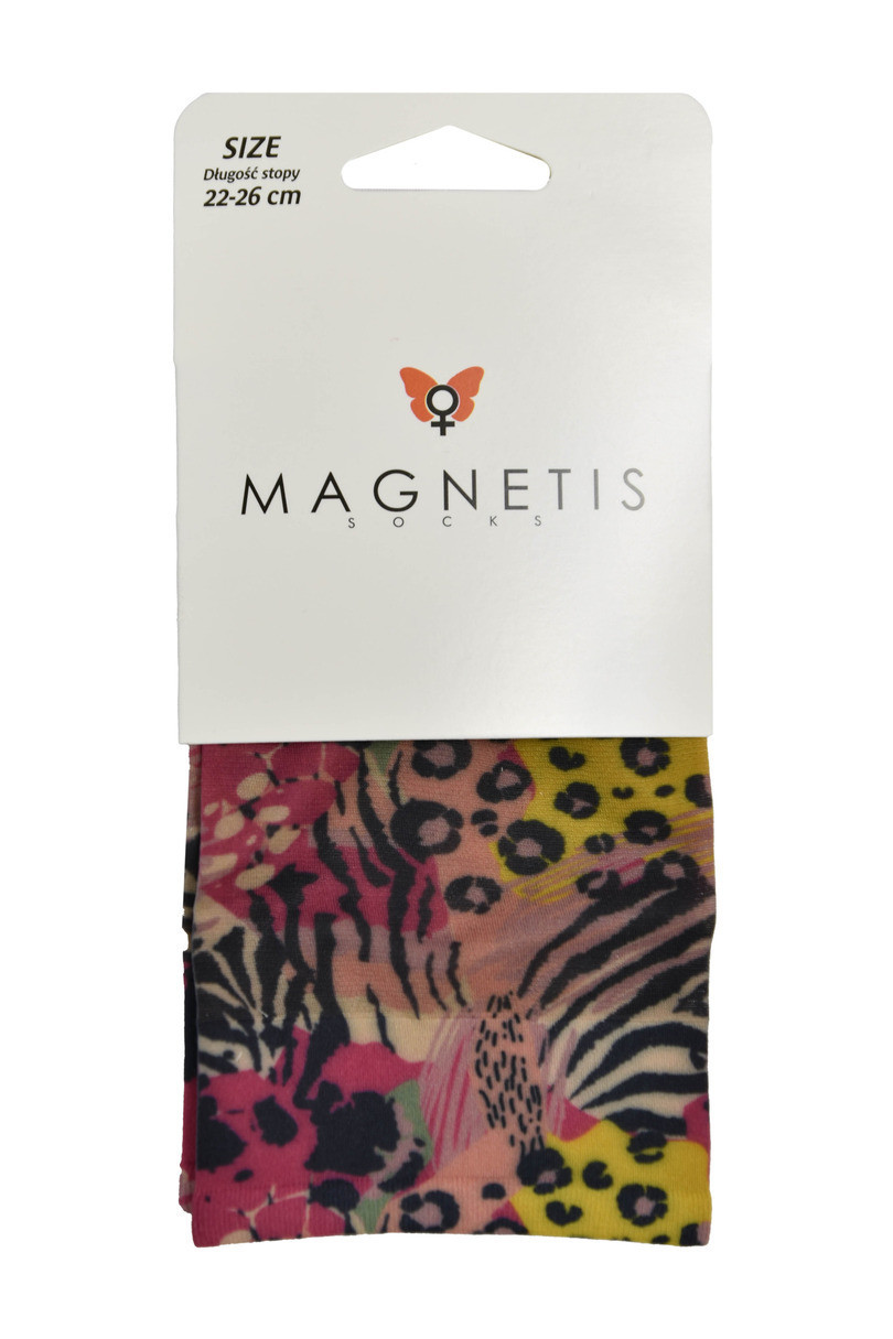 Postaw na odważny i pełen energii styl z kolorowymi skarpetkami Magnetis 15 DEN. Połączenie zwierzęcych motywów – panterki i zebry – z intensywnymi barwami różu, żółci i czerni tworzy niepowtarzalny wzór, który przyciąga spojrzenia i dodaje charakteru każdej stylizacji. To idealny dodatek dla kobiet, które lubią wyraziste akcenty i modowe eksperymenty.Lekka, półtransparentna tkanina o grubości 15 DEN zapewnia subtelność i wygodę, a dzięki elastycznej mieszance poliamidu i elastanu skarpetki idealnie dopasowują się do stopy. Komfort noszenia połączony z oryginalnym designem sprawia, że to must-have w kobiecej garderobie.