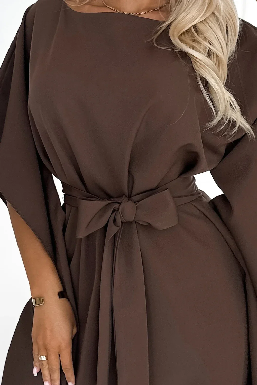 SOFIA Dámské šaty v čokoládové barvě se zavazováním v pase model 20519998 - numoco