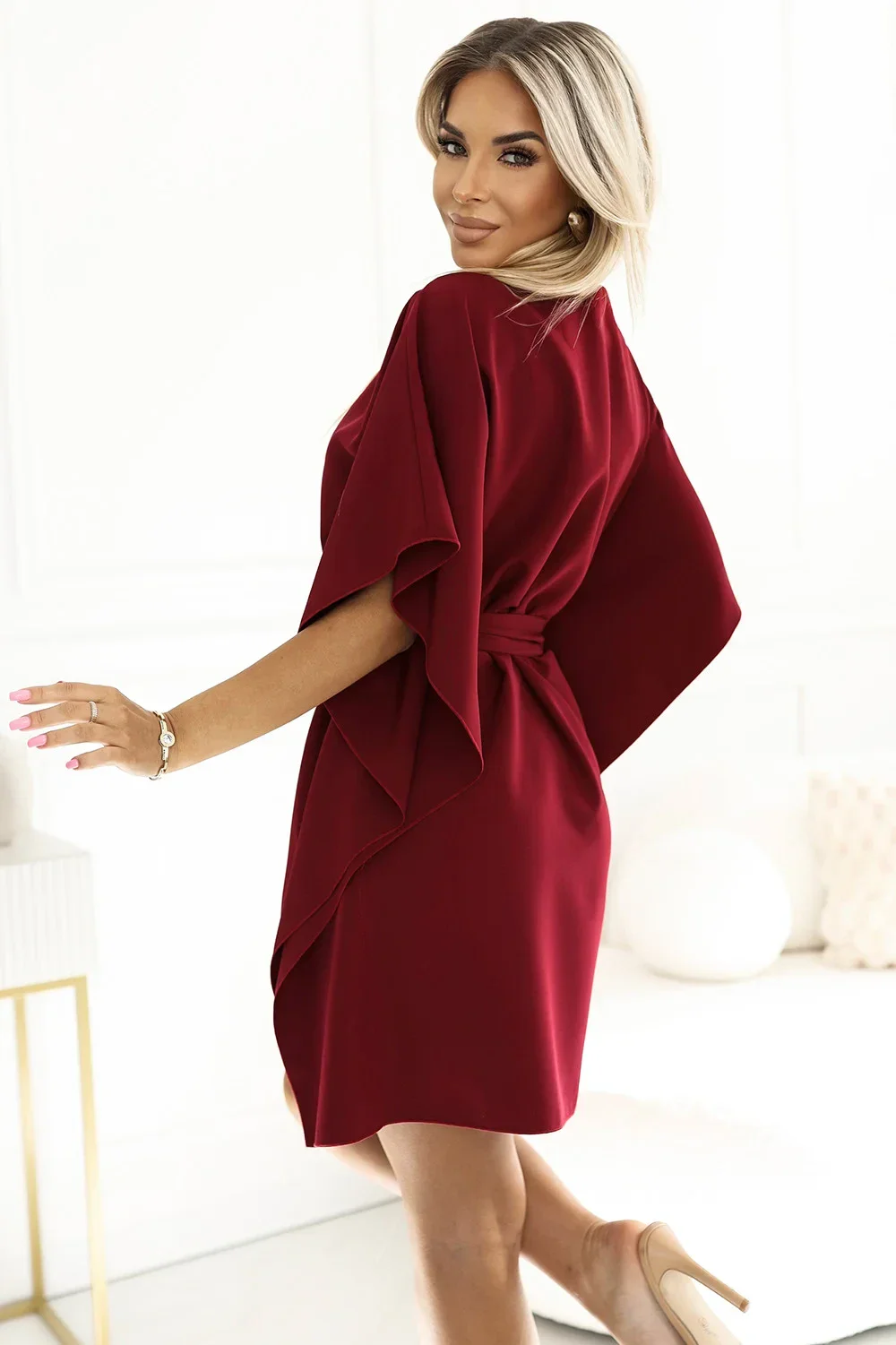 Šaty jsou ušité z materiálu příjemného na dotyk, který je při nošení pohodlný a umožňuje svobodu pohybu. Materiál má elegantní vínovou bordó barvu. Tento model je ideální pro různé příležitosti - jak pro každodenní nošení, tak i pro formálnější příležitosti. Šaty jsou vyrobené v Polsku s nejvyšší mírou pečlivosti a pozornosti na každý detail.