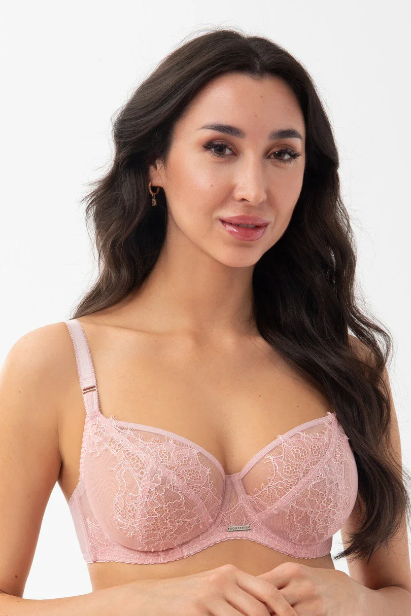 Biustonosz miękki przeznaczony dla kobiet ze średnim i dużym biustem. Zapewnia efekt uniesienia i zebrania biustu do środka, 3-częściowe miski wykonane ze stabilnej koronki z rzęskami na tiulu stabilnym, przeszyte ozdobną metaliczną nitką. Górna krawędź miski wykończona gładką taśmą. Tył z transparentnej lycry zapewniającej bardzo dobre dopasowanie i podtrzymanie. Fiszbiny boczne zapobiegające zwijaniu się materiału. W zależności od rozmiaru dwu lub trzyrzędowa haftka z trójstopniową regulacją obwodu. Nieodpinane, regulowane ramiączka w trzech szerokościach, w większych rozmiarach dodatkowo wzmocnione welurową taśmą. Metalowe elementy w kolorze srebrnym (nie zawierają niklu)