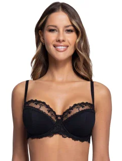 Klasická měkká podprsenka. Vyrobeno z hladkých materiálů v kombinaci s elegantní výšivkou. Košíčky dobře sbírají poprsí a udržují ho na místě, přičemž krásně odhalují dekolt. Spodní část košíčků je vyrobena ze stabilní, hladké, matné pleteniny. Horní část je vyrobena z výšivky podšité jemnou síťovinou pro zpevnění. Uprostřed mezi šálky je mašle zdobená drobnými šperky.