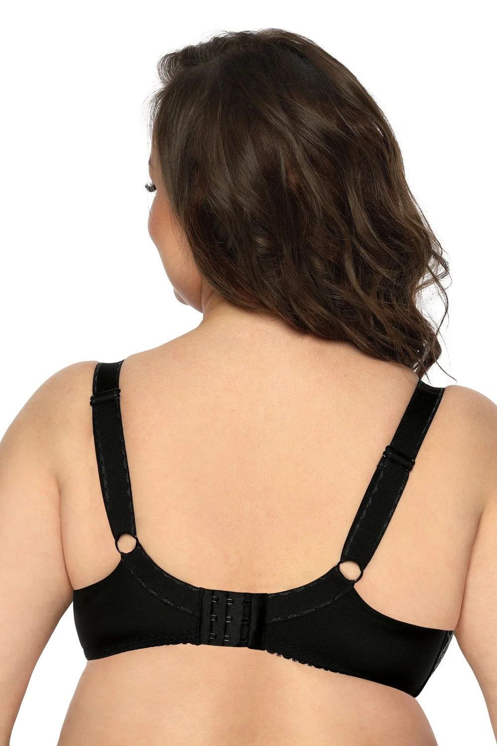 Smyslný, měkký podprsenka Lissy určený pro dámy s větším poprsím. Přední část vyrobena z barevné krajky. Vrch misek obšitý béžovou síťkou. Zadní část vyrobena z černého elastického materiálu. Model má boční kostice. Ramínka nastavitelná, neodnímatelná. Uprostřed misek malá mašlička. Zapínání dvourychlostní nebo třírychlostní v závislosti na velikosti s třístupňovým nastavením.